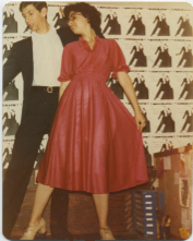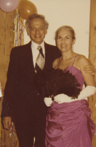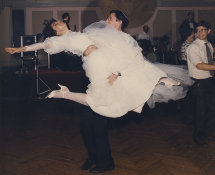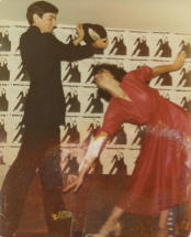 Eric, top hat, & Diane in front of Diane’s bedroom poster wall of Fred & Ginger