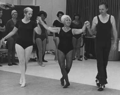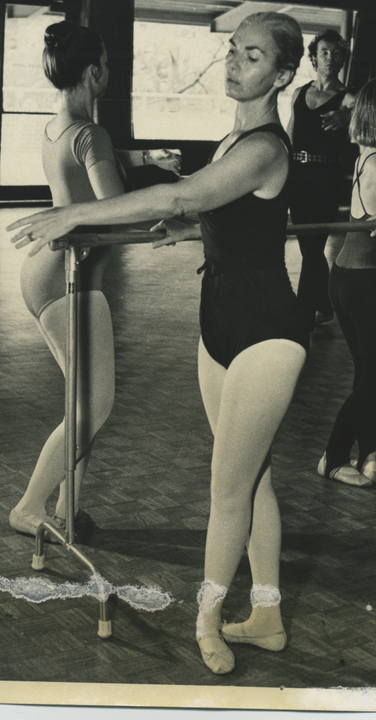 When Lisa was 14-17, she studied ballet with Ellen Eckhardt. Janet joined Ellen’s mothers’ class. That got Janet started in many more dance classes. Here she is doing bar exercises in a class of Vladimir’s (the man in the photo to the left), which she took with her friend, Fuzzy Sellis, in Baltimore.