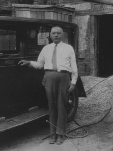 Max Segall with car in yard of M.B. Segall & Sons building supply store